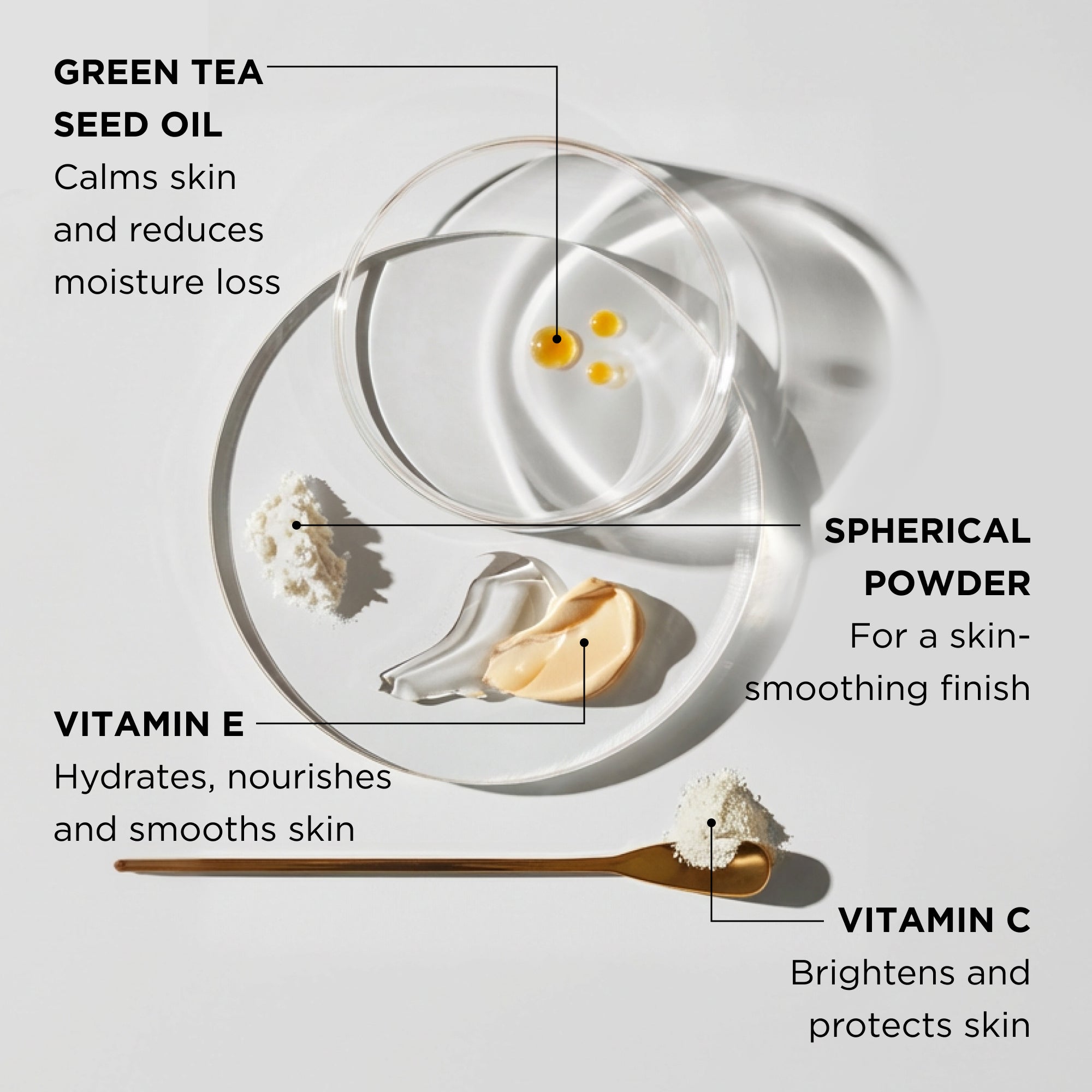 Isododecane, Cyclopentasiloxane, Polymethylsilsesquioxane (Spherical Powder), Dimethicone Crosspolymer, Dimethicone, Dimethicone/Vinyl Dimethicone Crosspolymer, Isononyl Isononanoate, Cyclohexasiloxane, Silica, PEG/PPG-18/18 Dimethicone, Triethoxycaprylylsilane, Tocopherol (Vitamin E), Carthamus Tinctorius (Safflower) Seed Oil, Ascorbyl Palmitate (Vitamin C), Camellia Oleifera (Green Tea) Seed Oil, Ricinus Communis (Castor) Seed Oil, Caprylyl Glycol, Phenoxyethanol, Potassium Sorbate, Aqua, Tocopheryl Acetate, Hexylene Glycol. May Contain/Peut Contenir: Iron Oxides (CI 77491, CI 77492, CI 77499), Titanium Dioxide (CI 77891).